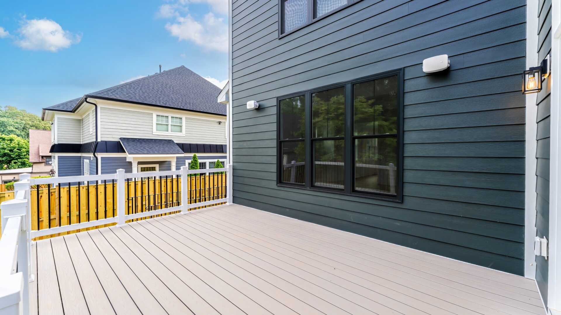 When designing your new deck, you will also need to choose what kind of rail material you prefer. Unless stated otherwise, we will install white vinyl railing. They look great, providing a crisp, clean finish!You can also choose vinyl rails with iron pickets. While more expensive, this modern look is gaining popularity!While we install a lot of decks and rear porches when building our homes, it is also something easy to do down the road if you can’t fit it into your budget. Regardless of when you decide to do it, the extra outdoor living space will absolutely increase the value of your home. It is one of those things that gives you a return on your investment immediately!