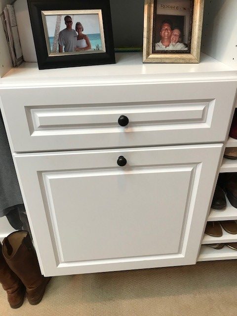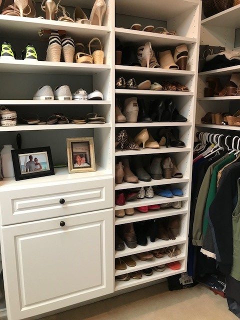 When Paul and I designed our closet almost 10 years ago, we had just finished building our home. We were pretty fatigued from the construction (it happens to everyone!) both from making decisions and from the money we had just spent. So we wanted to keep our closet fairly simple but we also knew what we wanted. For example, we knew we wanted to keep all of our clothes inside the closet (we didn’t want a dresser full of clothes in our actual bedroom). So we invested in more drawers but kept the finish of the closet standard white.