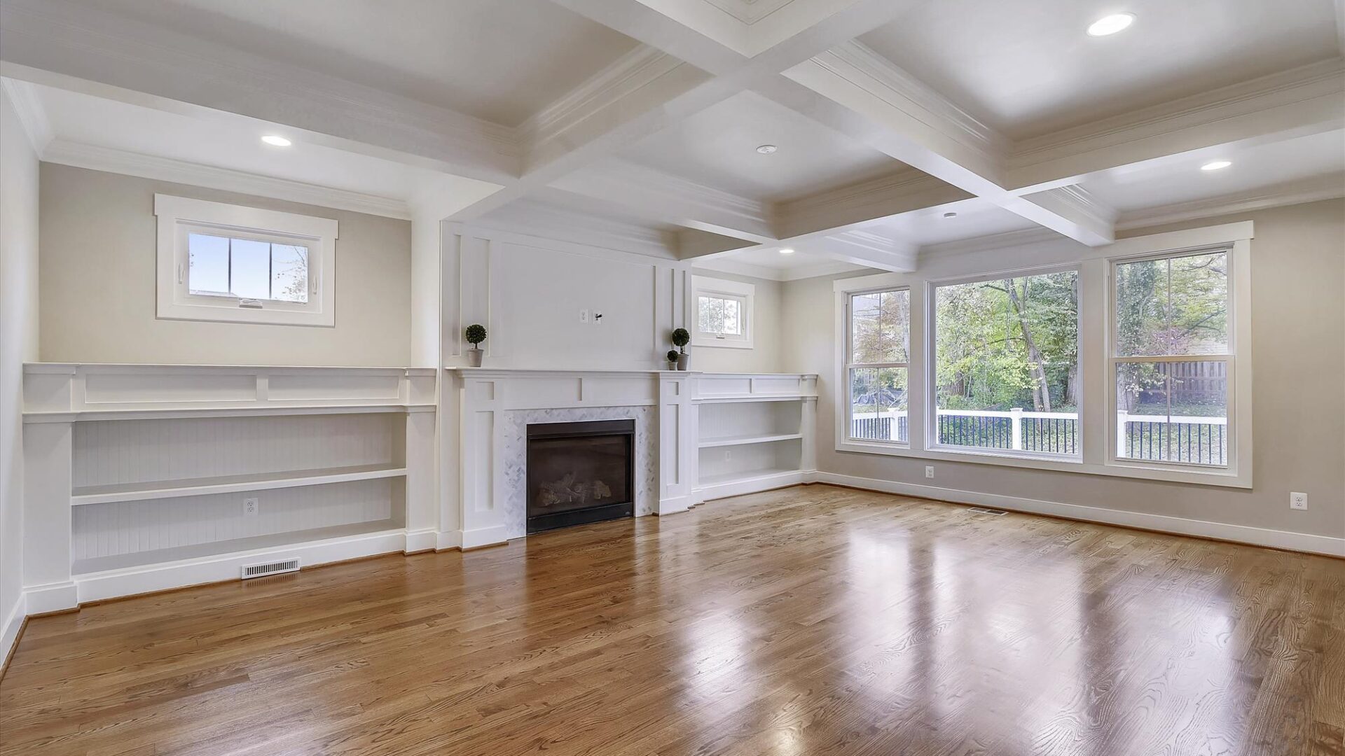 The Family Room. Specifically, the custom fireplace mantle and built in shelving. Because this room is so large, I really wanted to create a focal point. So we widened the fireplace projection, built a custom mantle and bookshelves, and voila!
