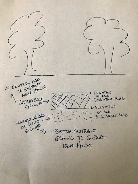 Siting your home too high may require a controlled pad. If the new basement slab is higher than the existing basement slab, the disturbed ground in between may not support the new house. During excavation for the new house, the excavator will need to get to solid ground and typically can’t if the new basement slab is higher than the old. If this condition presents itself, you may have to install a controlled pad (gravel) in order to support the new house. Here’s an illustration…