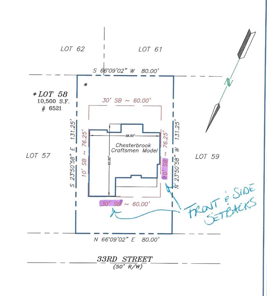 The actual footprint of the house we chose (Chesterbrook Craftsman) was 58.5′ x 60.5′. Here is a revised plat showing the new house location.