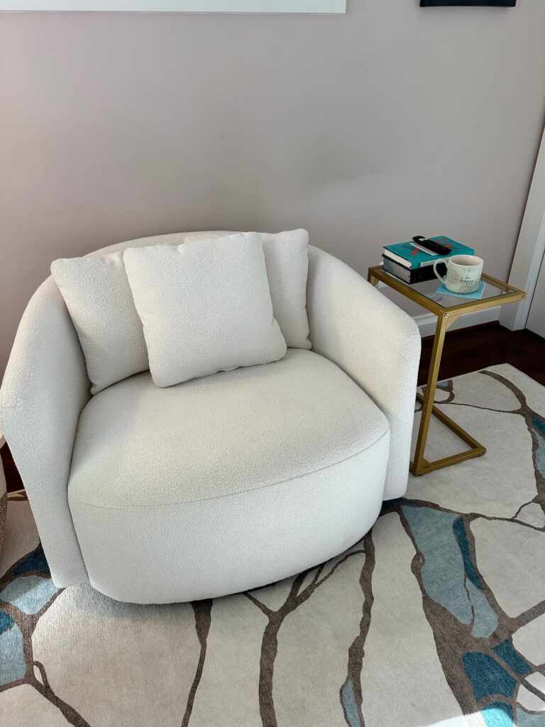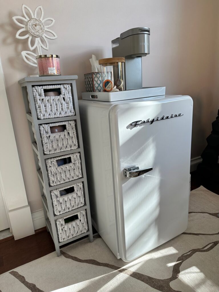 I start most of my mornings in this space, often before anyone else is awake. It feels like the luxury it is to have a room all to myself. There are little things I love about it, that make it extra special (to me). I setup this fun little beverage center so I can make coffee or grab something cold to drink. It’s an indulgence given my kitchen is just one flight of stairs away, but why not?