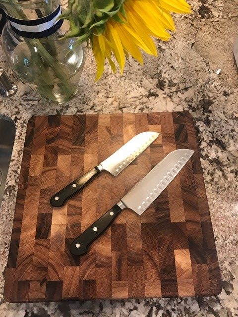 I keep my Boos cutting board right on my counter and I use it every day. It’s pretty so I don’t mind having it out all the time and I love the convenience of not having to pull it out of the cabinet for each use. Do you have good knives? Every home chef needs at least one good quality knife. I love my Wusthof knives. I have several different styles but I routinely reach for the Santoku. They’re a good weight and easy to handle!