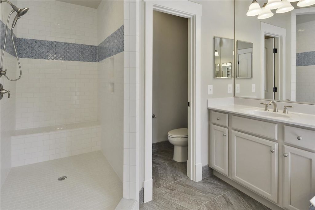 For this client, we installed it in a chevron pattern (which is a little extra $$) – isn’t it pretty? The “wood” tile is such a hot trend right now. We offer one that is included in the base price – check it out the next time you’re in the Design Center!