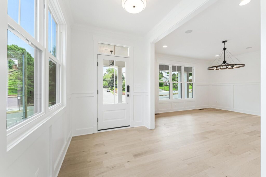 The dining room is to the side of the foyer.