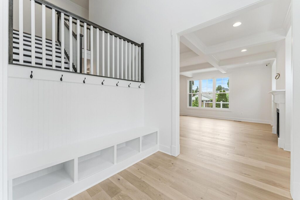 It also has this awesome built-in seat with hooks for guest coats.